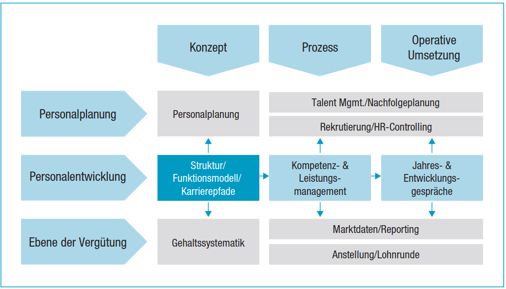 Dans l’idéal, les RH peuvent, grâce à l’introduction d’une évaluation analytique des fonctions, mettre en place une structure fonctionnelle claire et cohérente. L’évaluation analytique des fonctions est un outil efficace pour établir la comparabilité entre les fonctions et les différents secteurs de l’entreprise. Elle repose sur un référentiel uniforme et compréhensible, qui crée une base commune pour les décisions de politique du personnel. L’évaluation des fonctions permet d’apporter de la clarté quant aux qualifications et aux exigences requises pour l’ensemble des fonctions, de structurer systématiquement les parcours de développement et d’élaborer directement des descriptions de fonctions structurées.